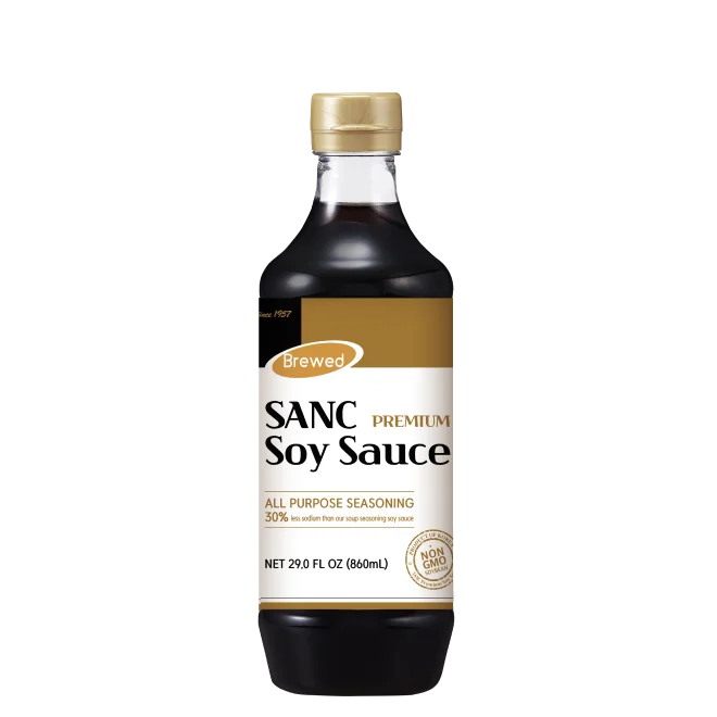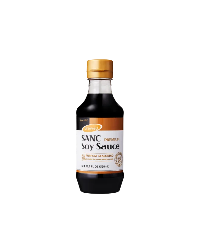 Brewed soy sauce is made by fermenting and aging soybeans or fat-free soybeans and grains for a long period of time by inoculating them with selected bacteria instead of meju. It is characterized by a long production period of more than six months, a unique deep and mellow flavor and aroma originating from microorganisms, and a very rich, sweet taste and dark color.